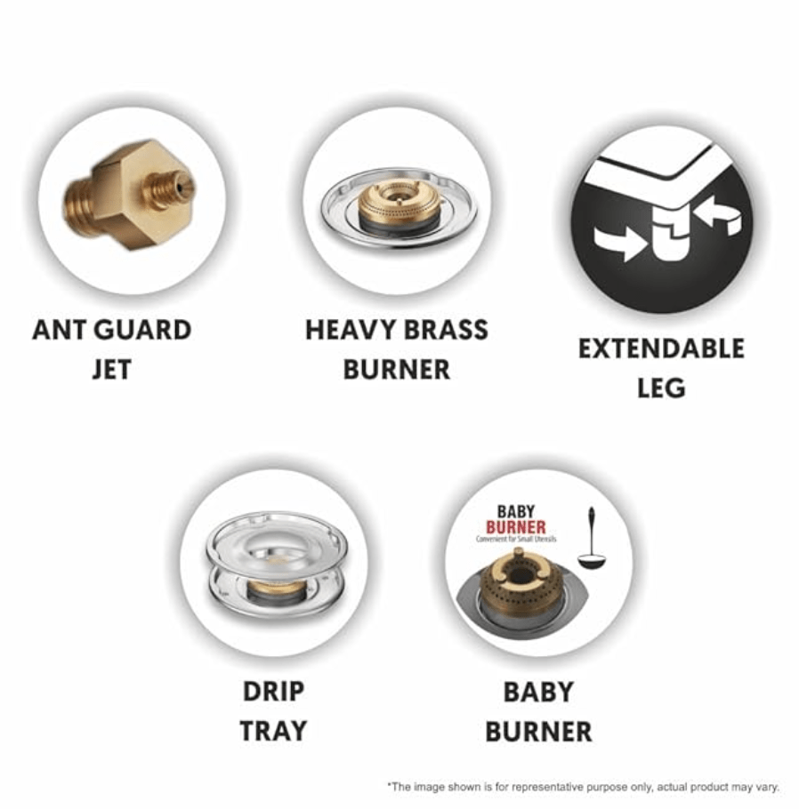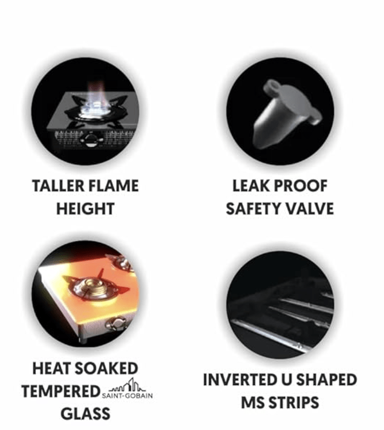 | Special Feature | Saint-Gobain heat soaked glass with Life Time Warranty, Dura-Forged Brass Burners with Life Time Warranty for faster cooking, Removable drip tray for convenient and easy cleaning, High safety leak proof valve for trouble free operations, Saves 5 days of gas: Heavy brass burners and proper air-LPG mixing gives a blue flame. Saves 2 cylinders every year, Extendable legs for easy lifting and cleaning, Lifelong free service at brand customer care centre |