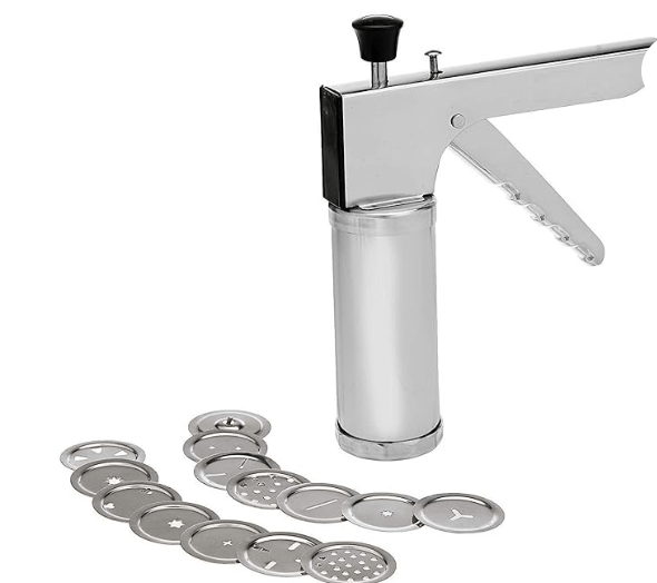 Stainless Steel Kitchen Press Grater Cookies Impress your dinner guests by making your very own 'Bombay Mix' using this stainless steel kitchen press or Sev Maker (Murukku maker) from Capital. It has a tall and cylindrical shape, a deep container to hold the batter and an easy press to make the savouries of your choice. It comes with 15 different disc templates for creating the perfect mix. You can use the mirror-finished press to make many sweet and savoury delights in your kitchen! Different disc templates It comes with different disc templates or jaalis for various shaped snacks. This kitchen press creates consistent shapes every time. Stainless steel body stainless steel kitchen press is manufactured using durable stainless steel which makes it robust and stable while you use it. It's anti-corrosive and easy to clean. Kitchen Press Grater Cookies/Indian Snakes/Murukku Maker/Farsan Sev Maker