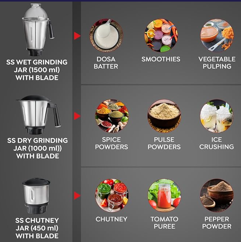 - CAPACITY of JARS: Wet Grinding Jar: 1.5L, Dry Grinding Jar: 1L and Chutney Jar: 450ml, grinds tough ingredients with ease.