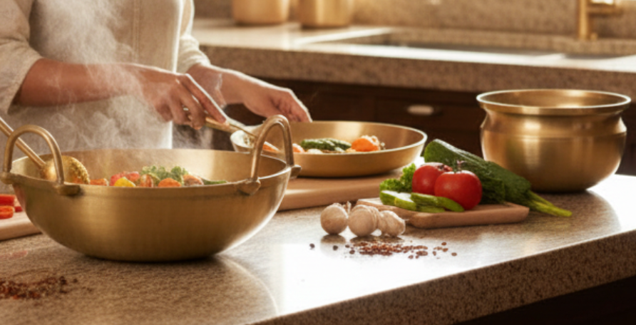 Bronze cookware offers Ayurvedic benefits due to its non-reactive nature and even heat distribution. It helps balance the body's dosha and retains over 98% of the food's nutrition, making the dishes flavorful and nutritionally rich. Cooking in bronze cookware promotes health consciousness, avoiding potential risks associated with using copper or brass with acidic foods. Its unique aroma enhances the culinary experience, making cooking a mindful and enjoyable process aligned with Ayurvedic principles.