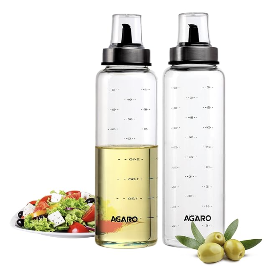 AGARO एलीट बोरोसिलिकेट ग्लास ऑयल डिस्पेंसर, क्षमता चिह्नों के साथ, 2 का पैक, 500 मिली प्रत्येक, धातु का ढक्कन, तेल की बोतल जार, पारदर्शी