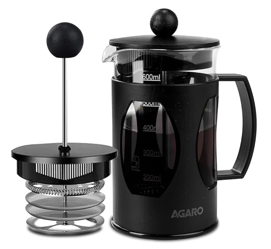 AGARO एलीट फ्रेंच प्रेस कॉफ़ी और चाय मेकर, स्लीव्स के साथ बोरोसिलिकेट ग्लास बॉडी, ग्लास कैरफ़, BPA मुक्त प्लास्टिक ढक्कन स्ट्रेनर, 600ml