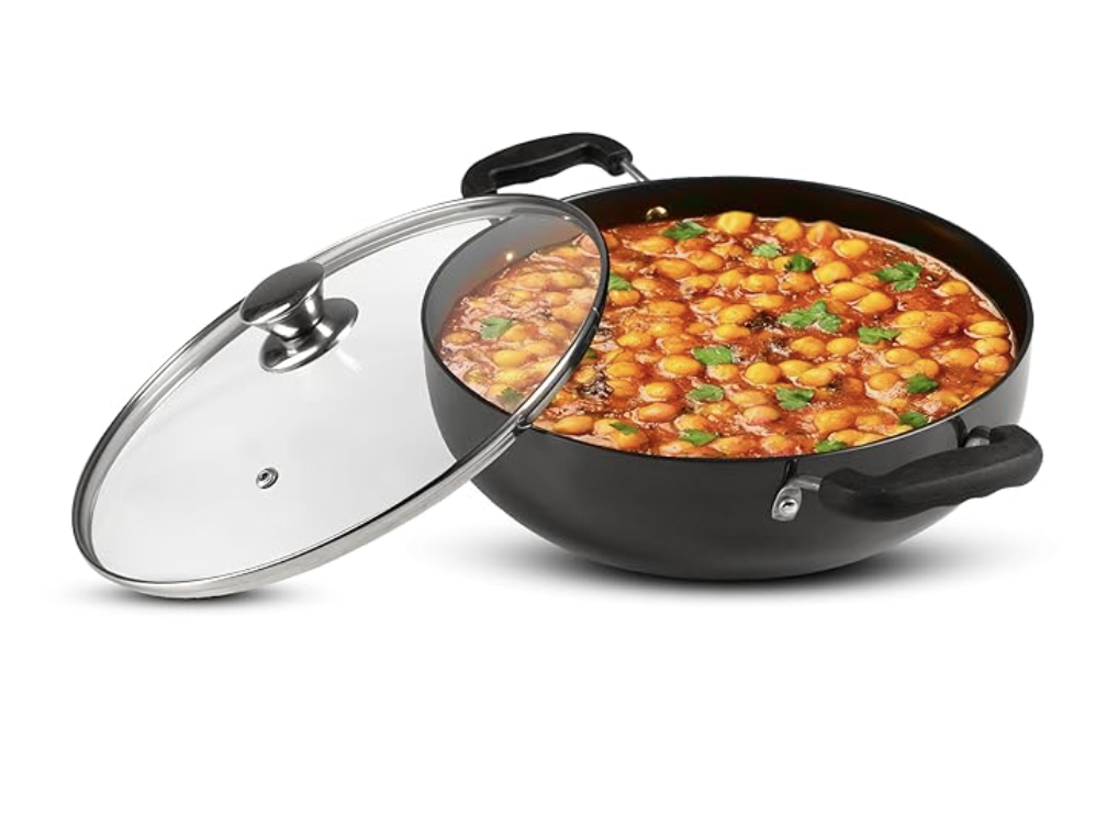 AGARO Elite हार्ड एनोडाइज्ड कढ़ाई ग्लास ढक्कन के साथ, 3.85L क्षमता, 28 cm व्यास, गैस ओवन के अनुकूल, रिवेटेड हैंडल, 3mm मोटी प्लेट, खाना पकाना, तलना, परोसना, काला