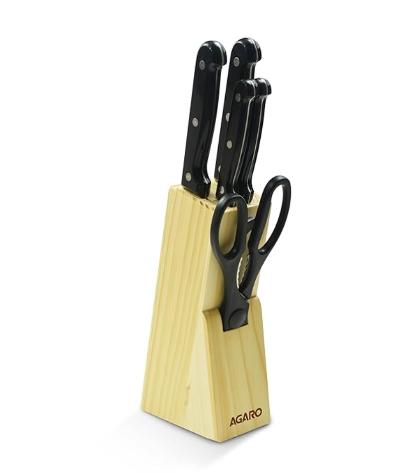 AGARO Galaxy 6 पीस किचन चाकू सेट लकड़ी के केस के साथ, 4 चाकू, 1 कैंची, 1 लकड़ी का केस, हाई कार्बन स्टेनलेस स्टील, नॉन स्लिप ट्रिपल रिवेट मज़बूत हैंडल, खाना पकाना, काटना, टुकड़े करना, सिल्वर