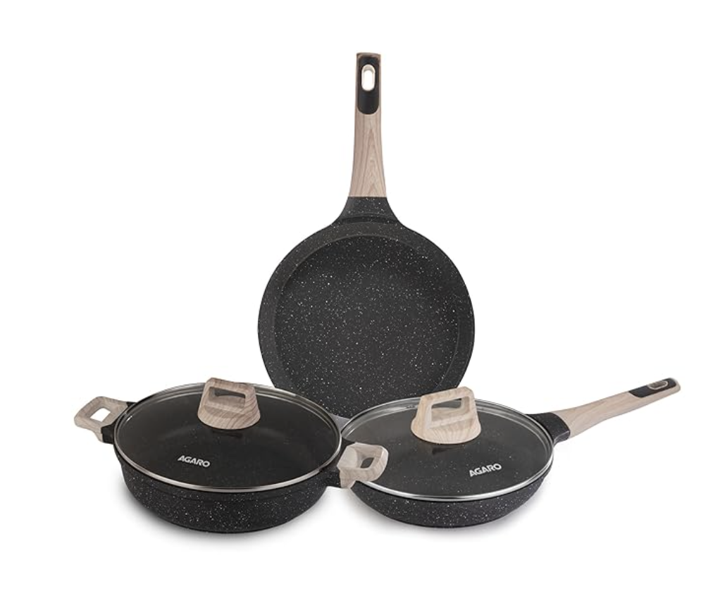 AGARO इम्पीरियल ग्रेनाइट नॉन-स्टिक कुकवेयर सेट, 3 पीस कुकवेयर सेट, 24cm फ्राइंग पैन ग्लास लिड के साथ, 28cm डोसा तवा, 28cm कढ़ाई ग्लास लिड के साथ, कास्ट एल्युमीनियम बॉडी, गैस और इंडक्शन कम्पैटिबल, गहरा ग्रे