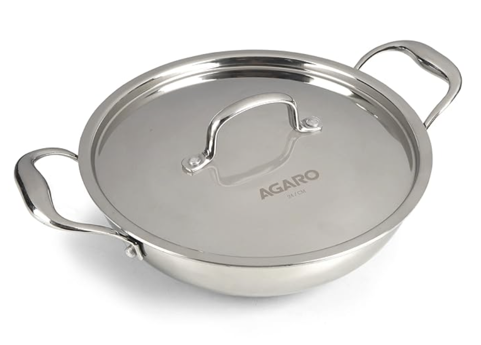 AGARO रीजेंसी ट्राई-प्लाई स्टील कढ़ाई, 2.25 लीटर क्षमता, 24 सेमी व्यास, स्टेनलेस स्टील, रिवेटेड हैंडल, खाद्य सुरक्षित, गैस ओवन और इंडक्शन ओवन के अनुकूल, खाना पकाना, तलना, परोसना, सिल्वर