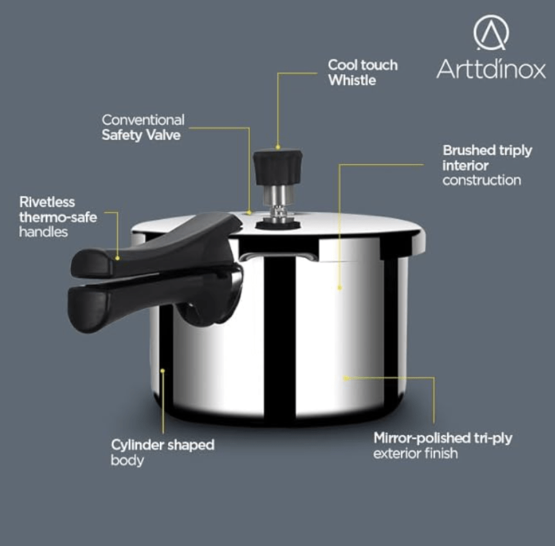 ARTTDINOX स्टेलर स्टेनलेस स्टील ट्रिपली 3 लीटर मिरर फ़िनिश प्रेशर कुकर गैस्केट के साथ | रिवेटलेस हैंडल | इंडक्शन और गैस बेस | 7 साल की वारंटी | जिंदल स्टेनलेस