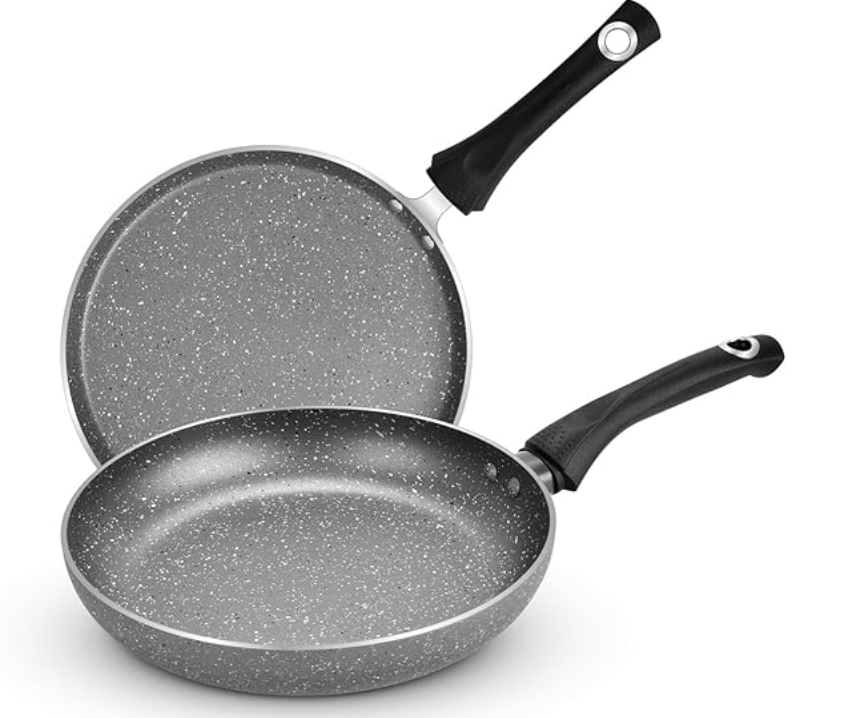 बर्गनर एल्युमीनियम बेलिनी मार्बल नॉन-स्टिक कुकवेयर सेट 2 पीस - डोसा तवा 28 सेमी, फ्राईपैन 24 सेमी, इंडक्शन कम्पैटिबल, बेकेलाइट हैंडल, Pfoa मुक्त, ग्रे