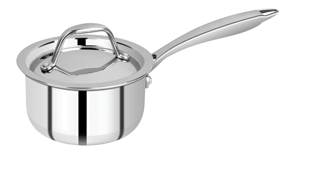बर्गनर अर्जेन्ट जूनियर शेफ ट्रिपली स्टेनलेस स्टील 12 सेमी सॉसपैन स्टेनलेस स्टील ढक्कन के साथ, 0.8 लीटर सॉसपैन/मिल्कपैन, टिकाऊ, मिरर फ़िनिश, इंडक्शन बेस और गैस रेडी, सिल्वर, 5 साल की वारंटी