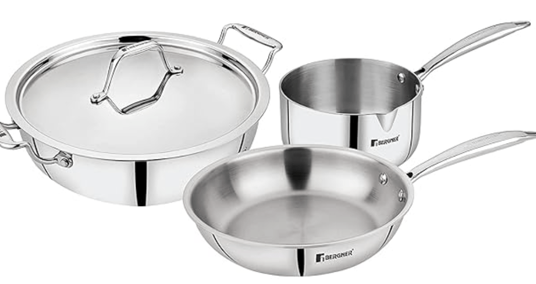 बर्गनर अर्जेन्ट ट्रिपली स्टेनलेस स्टील 4 पीस कुकवेयर सेट, 16 सेमी / 1 लीटर सॉस पैन, 24 सेमी / 2.5 लीटर कढ़ाई ढक्कन के साथ और 22 सेमी फ्राईपैन, 4 पीस कुकवेयर सेट, टिकाऊ, इंडक्शन और गैस रेडी, सिल्वर