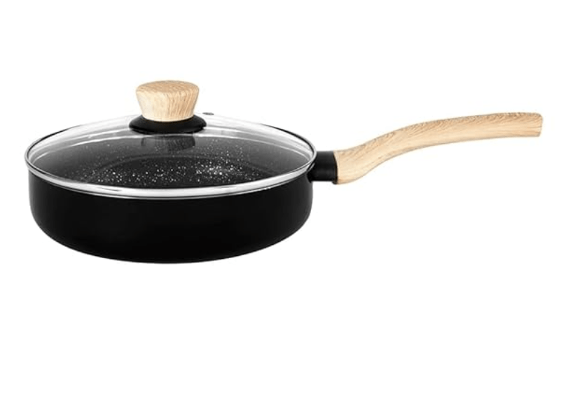 बर्गनर बेलिनी प्लस ऑरा 5-लेयर नॉन-स्टिक 20 सेमी डीप फ्राईपैन ग्लास लिड के साथ, 1.8 लीटर फ्राइंग पैन सॉफ्ट टच वुडन फिनिश हैंडल के साथ, और गैस स्टोव रेडी, बर्गनर द्वारा 1-वर्ष की वारंटी, काला