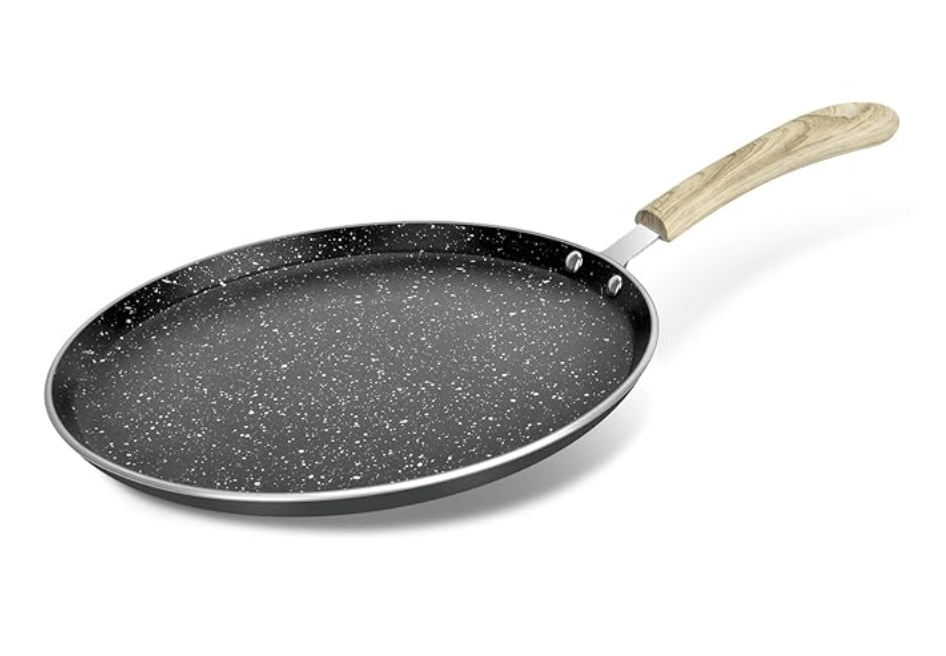 बर्गनर बेलिनी प्लस ऑरा 5-लेयर नॉन-स्टिक 28 सेमी डोसा तवा, सॉफ्ट टच वुडन फ़िनिश हैंडल, भोजन सुरक्षित, PFOA मुक्त, समान ताप वितरण, 4 मिमी मोटाई, इंडक्शन बॉटम, 1-वर्ष की वारंटी - काला