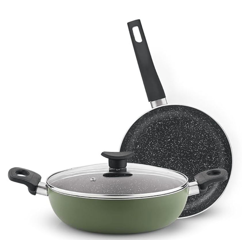 बर्गनर डाहलिया 3-लेयर नॉन-स्टिक कोटिंग 3 पीस कुकवेयर सेट - 24 सेमी (2.5 लीटर) कढ़ाई ग्लास ढक्कन और 24 सेमी फ्राईपैन के साथ, स्वस्थ खाना पकाने के लिए न्यूनतम तेल - इंडक्शन बॉटम, दिवाली/वर्षगांठ उपहार के लिए