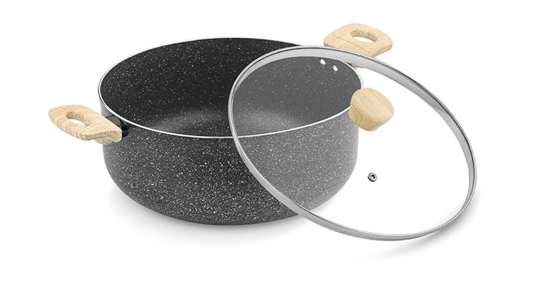 बर्गनर अर्थ ब्लैक नॉन-स्टिक 20 सेमी कैसरोल ग्लास ढक्कन के साथ, 3 लीटर कैसरोल लकड़ी की फिनिश के साथ सॉफ्ट टच हैंडल, 2.5 मिमी मोटाई, कम तेल की खपत, सफेद संगमरमर के छींटे, इंडक्शन बॉटम और गैस रेडी