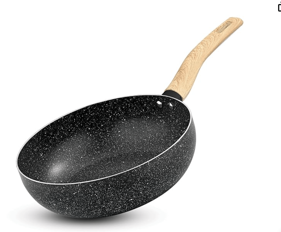 बर्गनर अर्थ ब्लैक नॉन-स्टिक 24 सेमी वोक, 3 लीटर वोक, लंबे लकड़ी के फिनिश वाला सॉफ्ट टच हैंडल, 2.5 मिमी मोटाई, कम तेल की खपत, समान ताप वितरण, सफ़ेद मार्बल स्प्लैटर, इंडक्शन बॉटम