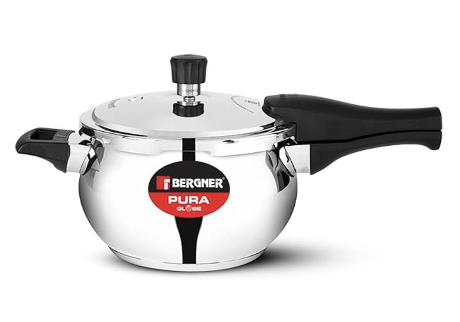 बर्गनर पुरा स्टेनलेस स्टील प्रेशर कुकर बाहरी ढक्कन के साथ, 3.5 लीटर, बेली शेप/हांडी कुकर, ट्रिपली बॉटम, इंडक्शन बेस, सिल्वर, गैस रेडी