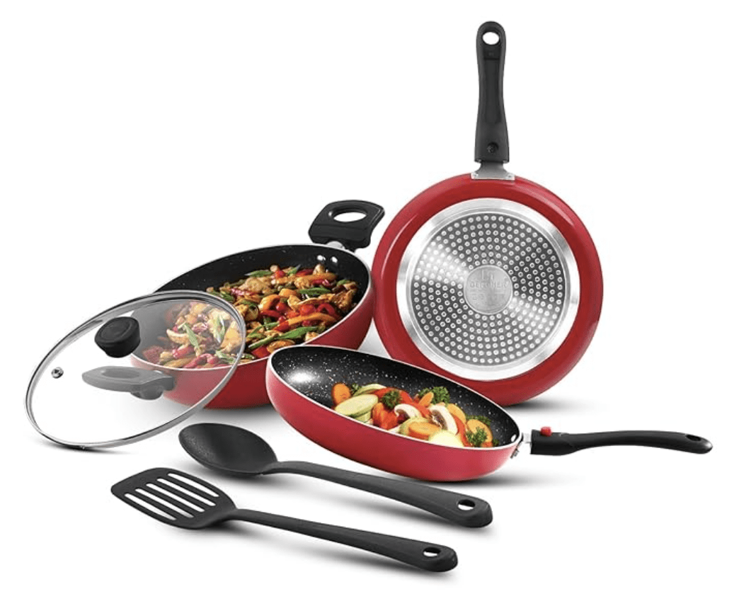 - 📦 6-पीस कुकवेयर सेट: इसमें वह सब कुछ शामिल है जो आपको रोज़ाना खाना पकाने के लिए चाहिए; ग्लास ढक्कन के साथ 24 सेमी कढ़ाई (2.5 लीटर), 24 सेमी फ्राइंग पैन (1.6 लीटर), 25 सेमी डोसा तवा, और 2 नायलॉन स्पैटुला