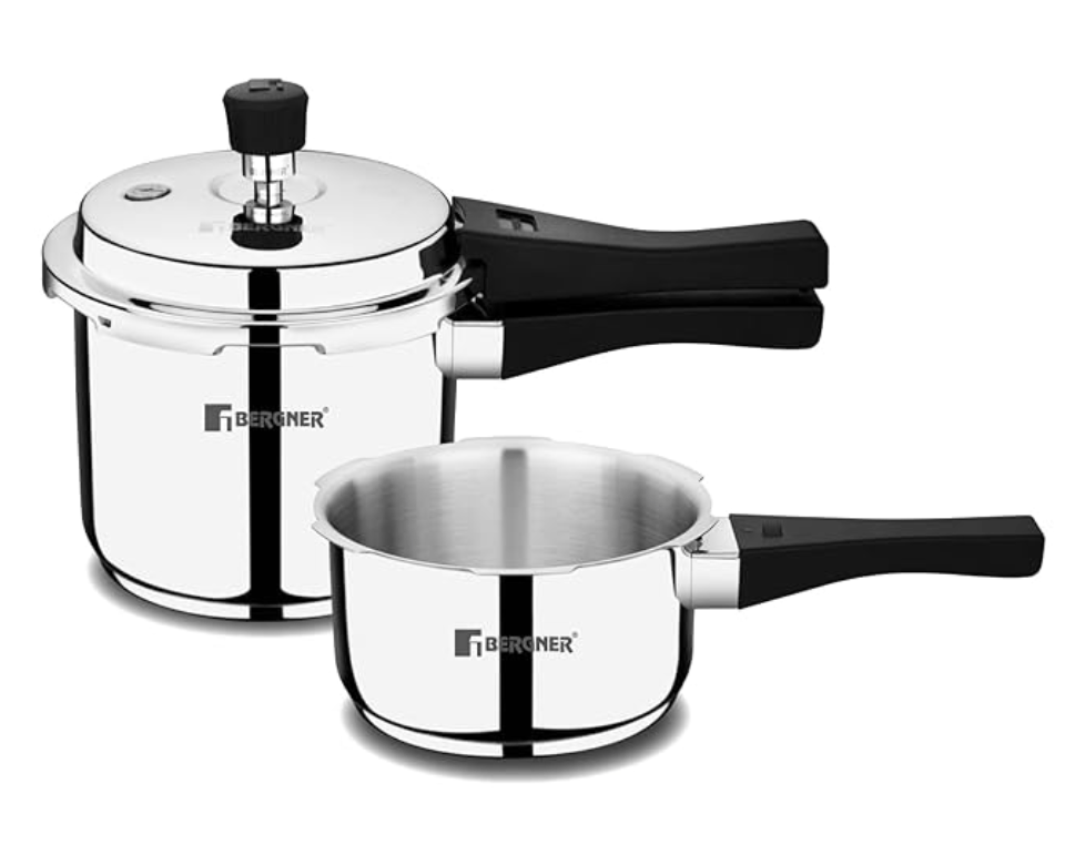 बर्गनर सोरेंटो स्टेनलेस स्टील आउटर लिड प्रेशर कुकर कॉम्बो - 2 लीटर और 3 लीटर कुकर, ट्रिपल बेस, भारी तली, आसानी से खुलने और बंद होने वाला, स्वास्थ्यवर्धक खाना पकाने वाला - इंडक्शन बॉटम और गैस स्टोव रेडी