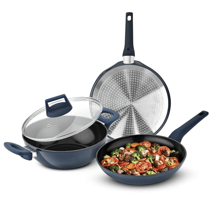 बर्गनर टाइटन फोर्ज्ड एल्युमीनियम 4 पीस कुकवेयर सेट - 24 सेमी (2.5 लीटर) कढ़ाई ग्लास ढक्कन के साथ, 24 सेमी (1.6 लीटर) फ्राईपैन, 28 सेमी डोसा तवा, रिवेटलेस सॉफ्ट टच हैंडल, मेटल चम्मच फ्रेंडली - इंडक्शन बॉटम
