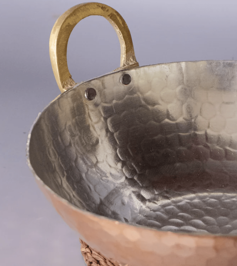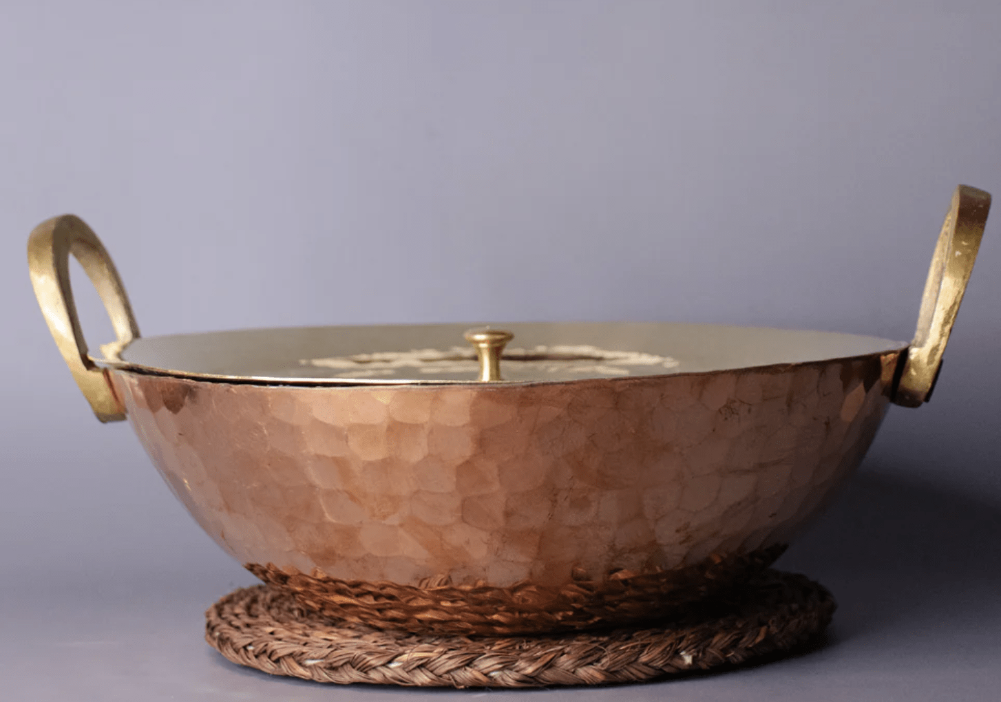 अमृतसर, पंजाब के पास ठठेरा के कारीगरों द्वारा सावधानीपूर्वक गढ़ी गई हस्तनिर्मित तांबे की कढ़ाई। यह उत्तम वस्तु आपके रसोईघर में भव्यता का स्पर्श जोड़ती है।