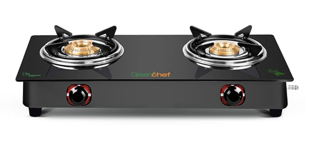 ग्रीनशेफ एलोन ग्लास कुक टॉप दो बर्नर गैस स्टोव, काली बॉडी (मैनुअल इग्निशन), मज़बूत ग्लास टॉप, कॉम्पैक्ट डिज़ाइन, पैन सपोर्ट - आईएसआई प्रमाणित
