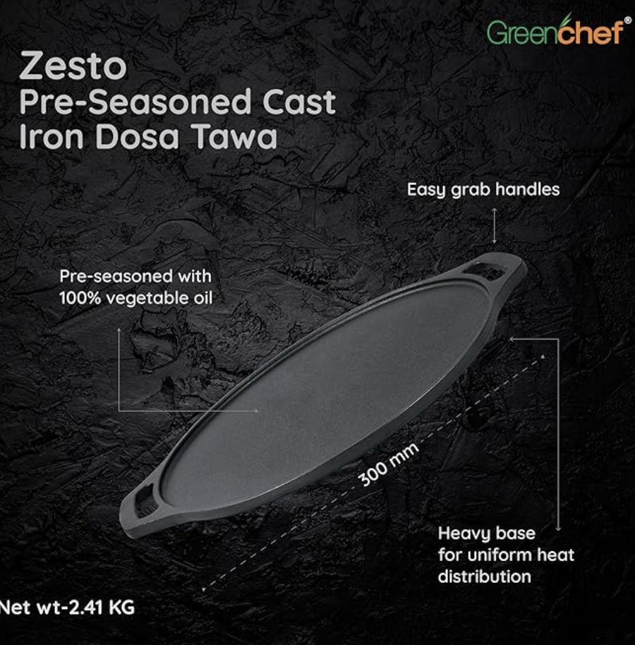 ग्रीनशेफ प्री-सीज़न्ड कास्ट आयरन ज़ेस्टो दोसा तवा 30 सेमी | 100% वनस्पति तेल में प्री-सीज़न्ड | प्राकृतिक रूप से नॉन-स्टिक | उच्च दबाव कास्टिंग | उच्च शक्ति | पुराने ज़माने का स्वाद वापस लाएँ | विष-मुक्त