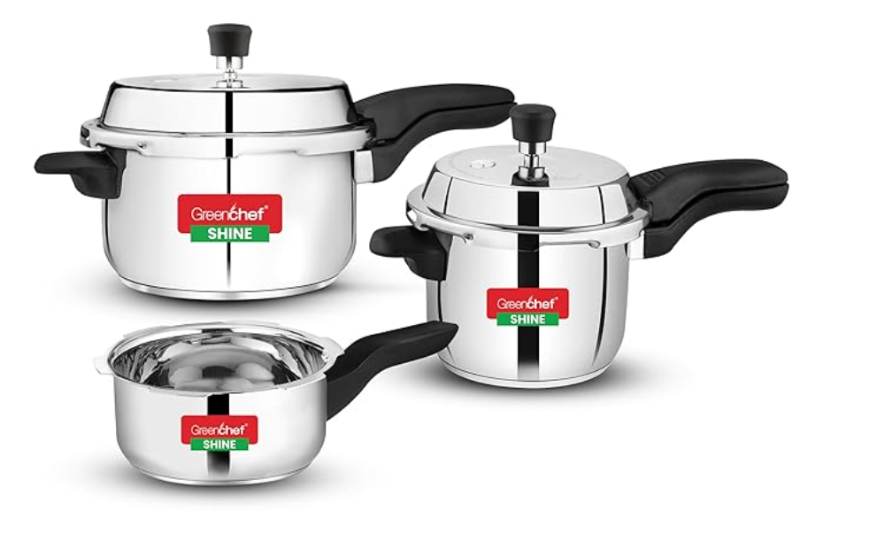 ग्रीनशेफ शाइन स्टेनलेस स्टील प्रेशर कुकर कॉम्बो बाहरी ढक्कन (5 लीटर + 3 लीटर + 2 लीटर पैन) - इंडक्शन संगत