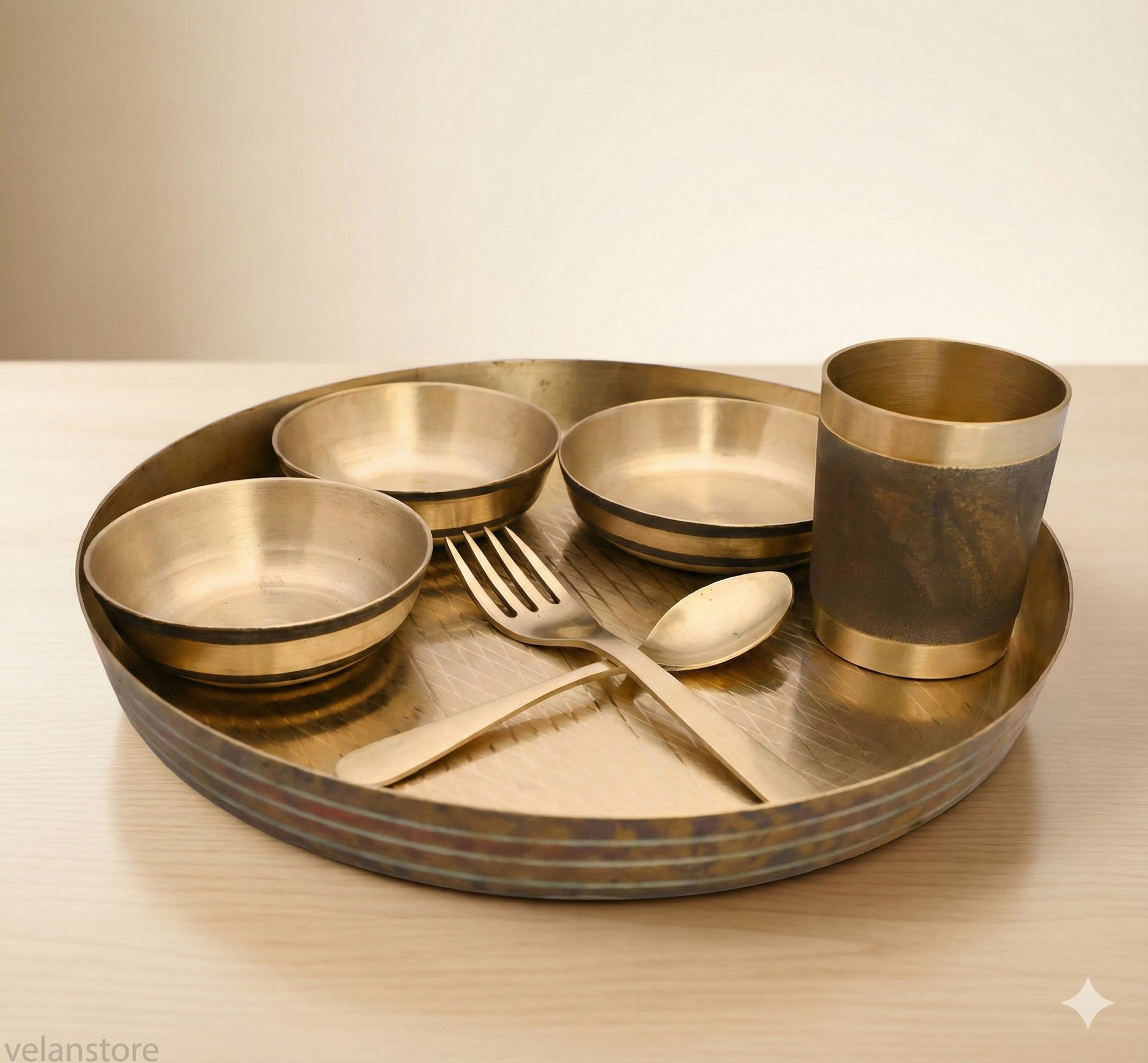 शुद्ध कांसे से बना हाथ से बुना हुआ 7 पीस का डिनर सेट - शानदार डिनर सेट