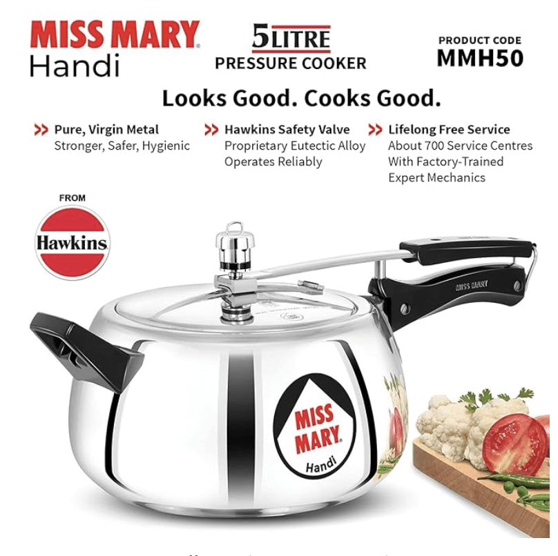 मिस मैरी हांडी प्रेशर कुकर में घुमावदार बॉडी है जिससे आसानी से हिलाया जा सकता है, खाना आसानी से निकाला जा सकता है और खाना बेहतर दिखाई देता है। इसका 3.25 मिमी मोटा धातु का बेस है जो ज़्यादा मज़बूत, सुरक्षित और स्वास्थ्यकर है। प्रत्येक मिस मैरी कुकर लीक-प्रूफ़ होने के लिए परखा गया है। इसमें बेहतर वेंट वेट (सीटी) है जो ज़्यादा कुशल है, दाल को कम अंकुरित होने देती है, तेज़ी से पकाती है और ईंधन बचाती है। प्रत्येक मिस मैरी हांडी में अंदर से फिट होने वाला ढक्कन होता है। यह डिज़ाइन पारंपरिक कुकरों की तुलना में स्वाभाविक रूप से सुरक्षित है। इस प्रकार यह सुरक्षा के लिए प्रेशर-लॉक है - जेटलाइनर दरवाजे की तरह! सेफ्टी वाल्व ढक्कन के हैंडल बार के नीचे स्थित है ताकि जब यह चले तो भाप सुरक्षित रूप से नीचे की ओर जाए। गैसकेट का कुकर के अंदर भाप से कम से कम संपर्क होता है, हर बार उत्पाद को खोलने और बंद करने पर रगड़ता नहीं है - इसलिए यह लंबे समय तक चलता है। ठंडे हैंडल। स्थिर मज़बूत पिवट प्लास्टिक के हैंडल पर दबाव नहीं डालता क्योंकि यह धातु के हैंडल का ही एक हिस्सा है। इस प्रकार हैंडल लंबे समय तक चलते हैं। गैस स्टोव पर इस्तेमाल के लिए सुझाया गया।