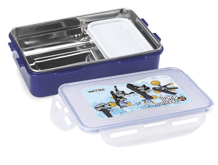 नयासा स्टील सुपर लॉक - 800 मिली, स्टेनलेस स्टील बच्चों के लंच बॉक्स, चार तरफ़ क्लिप और अंदर से हटाने योग्य कंटेनर, एयरटाइट ढक्कन के साथ, हल्का, ले जाने में आसान, बच्चों और वयस्कों के लिए आदर्श, नीला