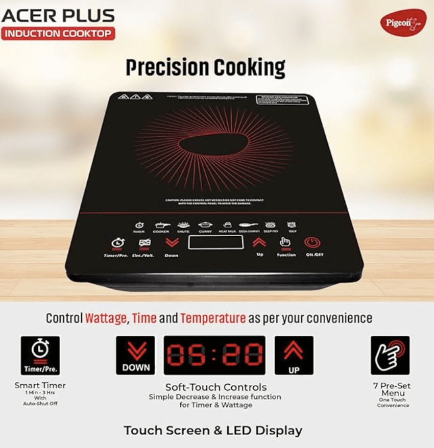 पिजन बाय स्टोवक्राफ्ट 14429 एसर प्लस 1800 वाट इंडक्शन कुकटॉप फेदर टच कंट्रोल के साथ, इंडक्शन स्टोव 8 प्रीसेट मेनू और ऑटो-शट ऑफ सुविधाओं के साथ आता है (काला)