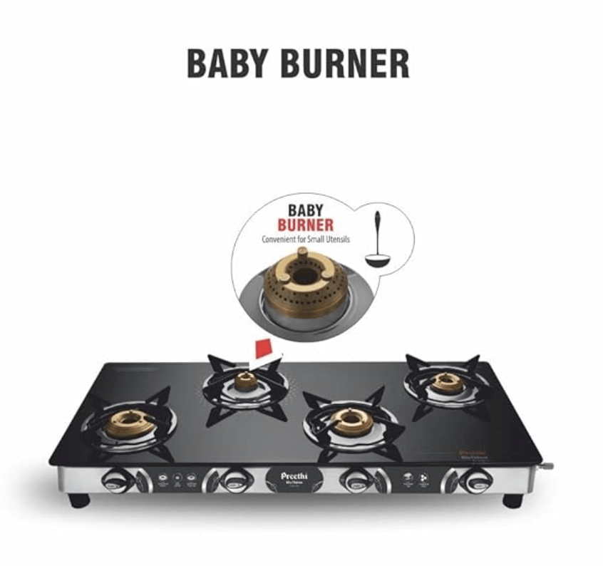 बेबी बर्नर:पहली बार इसमें एक छोटा बर्नर लगाया गया है, जो बिना अधिक गैस बर्बाद किए थोड़ी मात्रा में भोजन को गर्म करने, तड़का लगाने और भूनने की सुविधा देता है। |