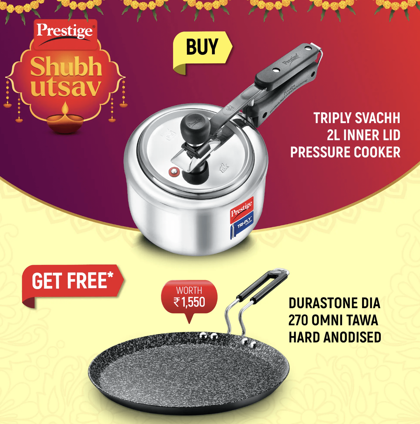 प्रेस्टीज 2 लीटर ट्राई-प्लाई स्वच्छ इनर लिड प्रेशर कुकर और ड्यूरास्टोन हार्ड एनोडाइज्ड 6 लेयर नॉन-स्टिक ओमनी तवा, 27 सेमी (काला)