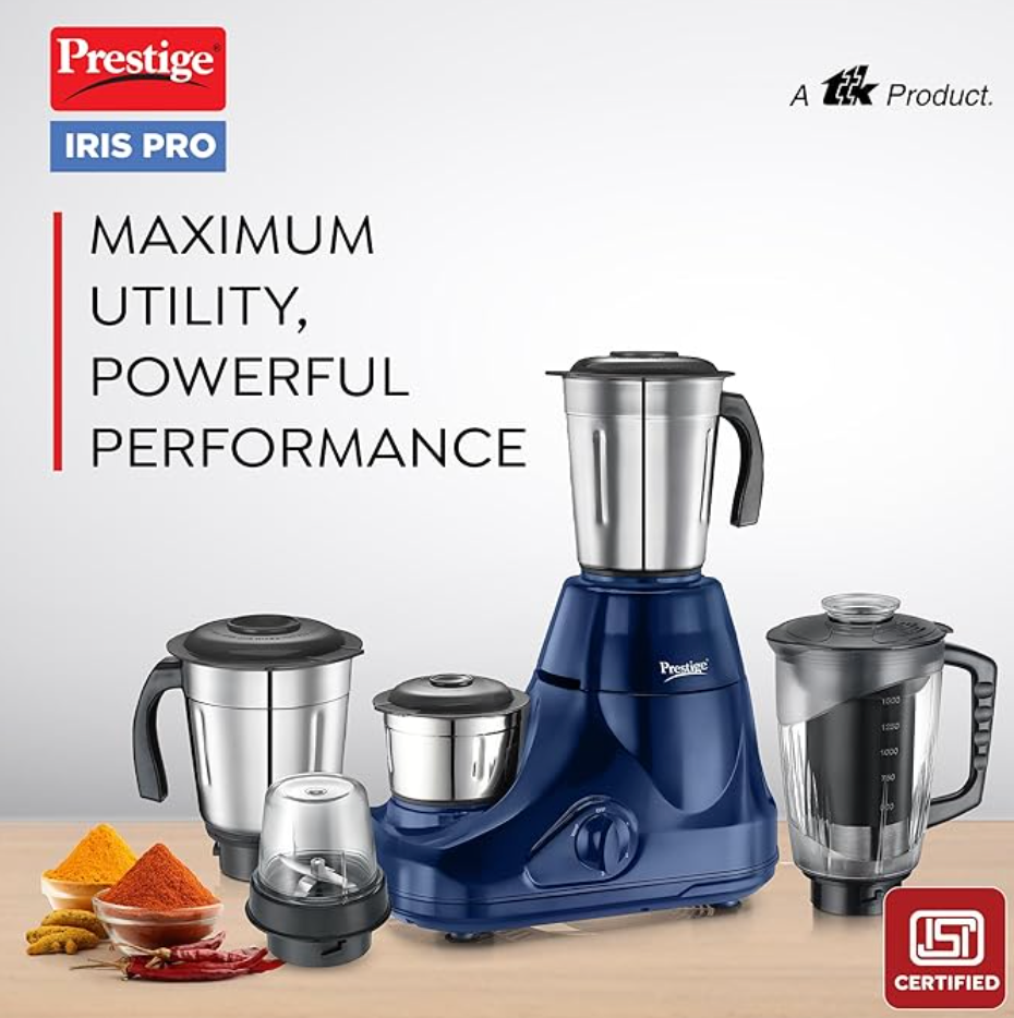 प्रेस्टीज 750 वॉट एस्ट्रा 5 जार जूसर मिक्सर ग्राइंडर | 3 स्टेनलेस स्टील जार | 1 पारदर्शी जूसर जार | 1 मिक्स-ओ-कीप जार | नीला