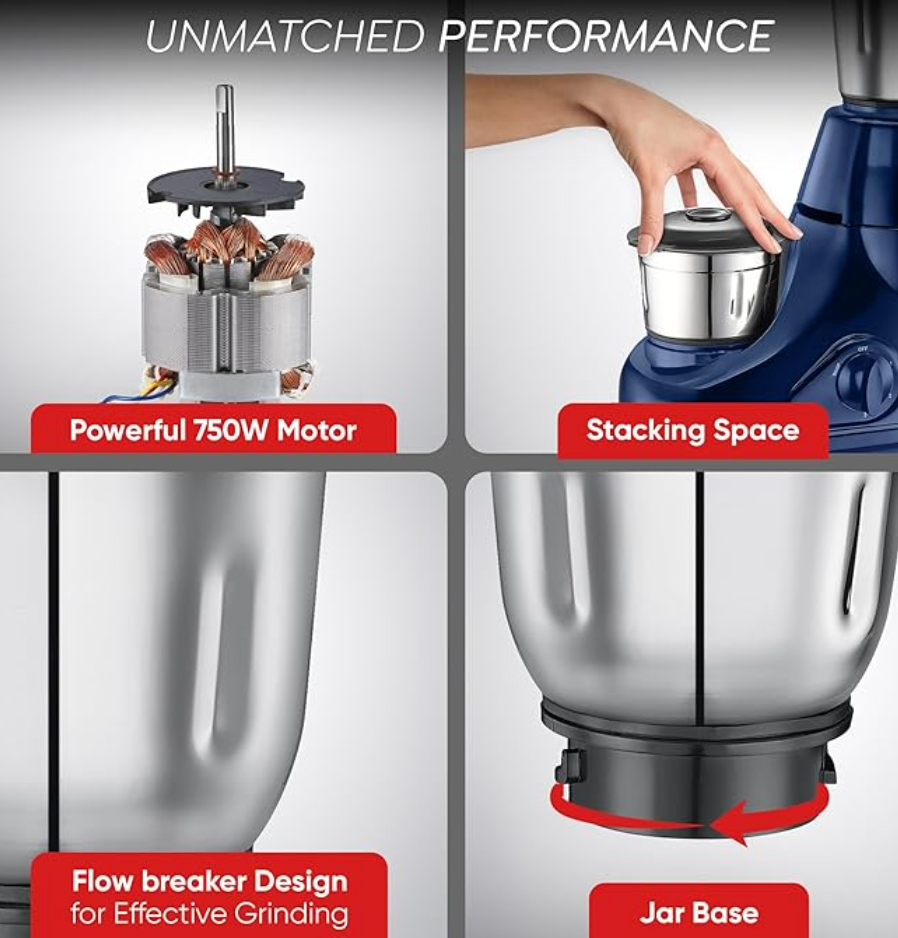 - ओवरलोड सुरक्षा से लैस शक्तिशाली 750 वाट की कॉपर मोटर: तेज़ और कुशल पिसाई के लिए उच्च-प्रदर्शन वाली 750 वाट की कॉपर मोटर से सुसज्जित। अंतर्निर्मित ओवरलोड प्रोटेक्टर ओवरहीटिंग को रोकता है, जिससे विश्वसनीय और लंबे समय तक चलने वाला प्रदर्शन सुनिश्चित होता है।