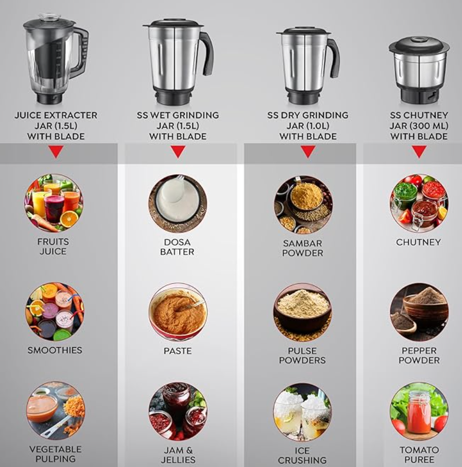 - 5 बहुउद्देशीय जार जिसमें मिक्स-ओ-कीप शामिल है: इसमें 3 स्टेनलेस स्टील जार (1.5 लीटर गीला, 1 लीटर सूखा, 300 मिलीलीटर चटनी), एक 1.5 लीटर पारदर्शी जूसर जार और एक मिक्स-ओ-कीप जार शामिल है - ताजे पिसे मसालों, चटनी या पेस्ट को स्टोर करने के लिए बिल्कुल सही।