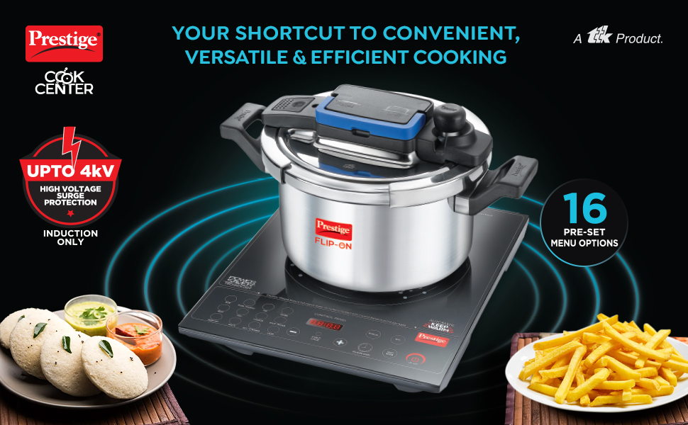 Prestige Cookcenter Induction Cooktop, Flip On Stainless Steel Pressure Cooker 5L 22cm Dia with Glass Lid, 4 Idly Plates, Frying Basket, Cake Mould 2.1, Cooker Separator 19cm Dia
