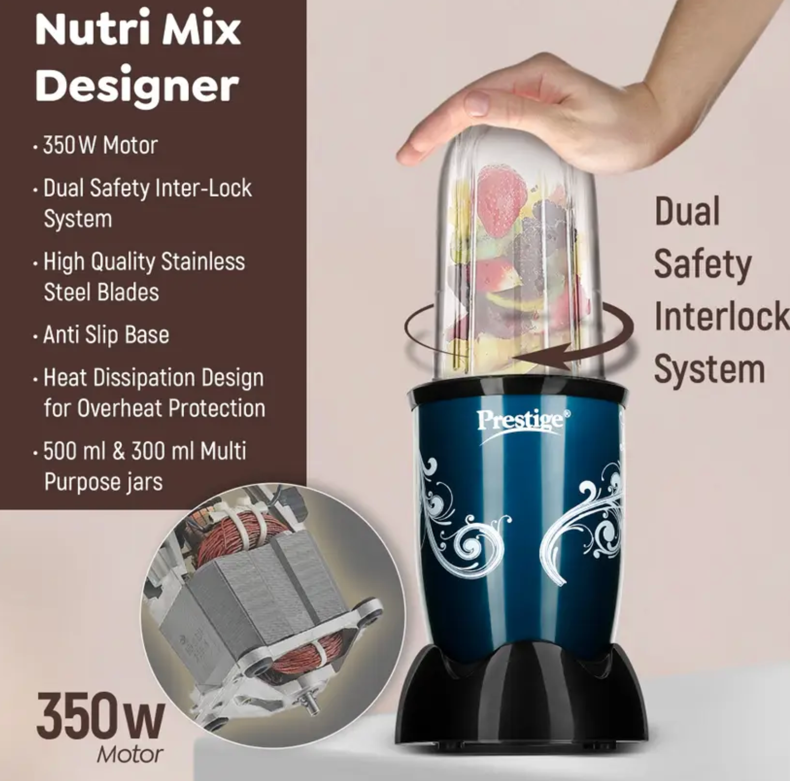 प्रेस्टीज डिज़ाइनर 350 वाट मिक्सर ग्राइंडर (न्यूट्रि-मिक्स | 2 जार | टील)