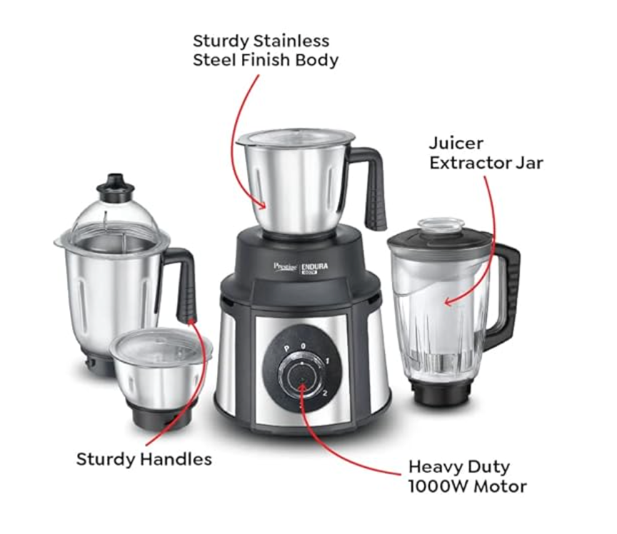 प्रेस्टीज एंडुरा 1000 वाट जूसर मिक्सर ग्राइंडर (मिक्सर | 4 जार | काला, सिल्वर)