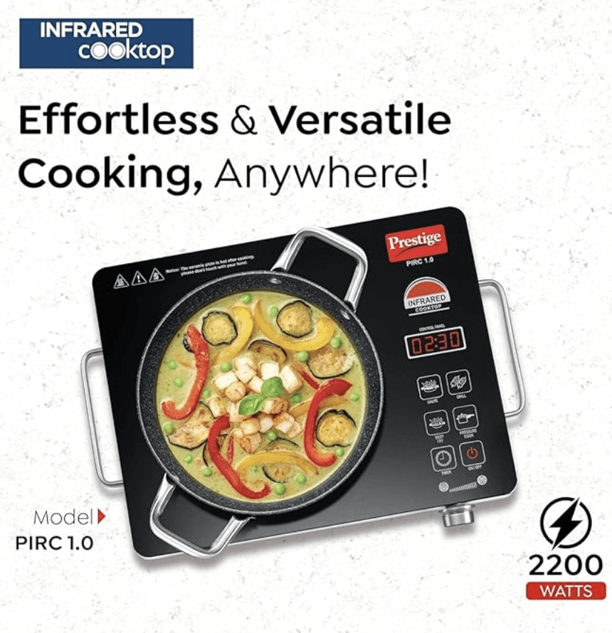 - रेडिएंट हीटिंग तकनीक - उन्नत रेडिएंट हीटिंग तकनीक के साथ कुशल और समान खाना पकाने का अनुभव प्राप्त करें। प्रेस्टीज इन्फ्रारेड कुकटॉप PIRC 1.0 हर बार पूरी तरह से पके हुए भोजन के लिए समान ताप वितरण सुनिश्चित करता है।