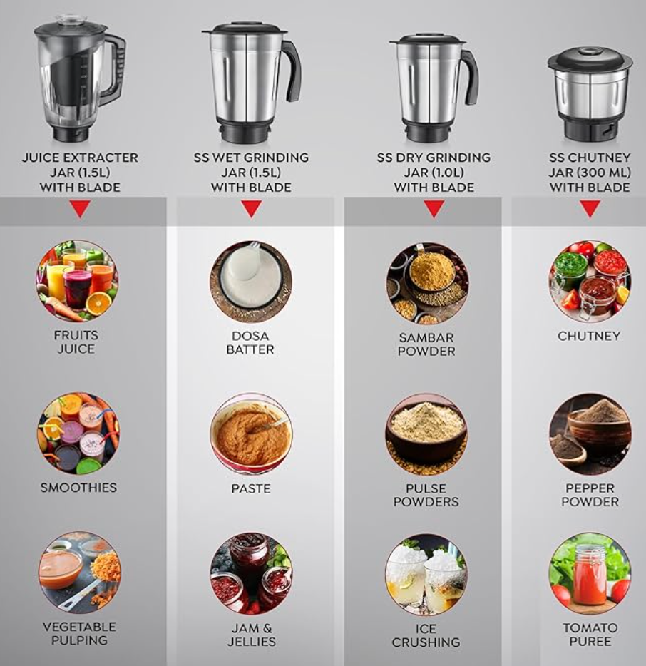 - जारों की क्षमता: गीला पीसने वाला जार: 1.5 लीटर, सूखा पीसने वाला जार: 1 लीटर, जूसर जार: 1.5 लीटर और चटनी जार: 300 मिलीलीटर, सख्त सामग्रियों को आसानी से पीसता है।