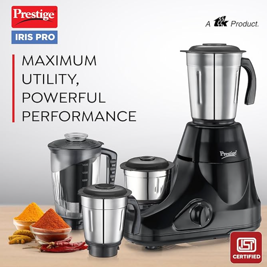 प्रेस्टीज आइरिस प्रो 750 वॉट मिक्सर ग्राइंडर, 4 जार के साथ (3 स्टेनलेस स्टील जार + 1 जूसर जार) | 4 बेहतरीन स्टेनलेस स्टील ब्लेड | जार रखने की जगह | मजबूत हैंडल | 2 साल की वारंटी | काला