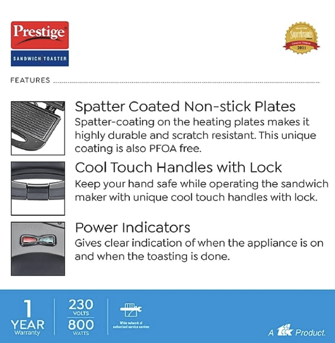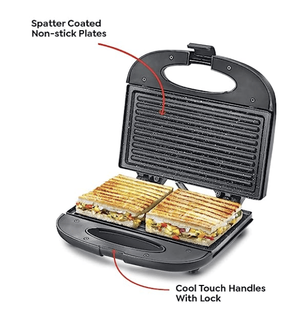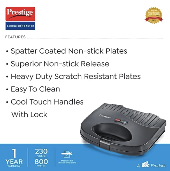 प्रेस्टीज पीजीएफएसपी - स्पैटर कोटेड नॉन-स्टिक सैंडविच टोस्टर, फिक्स्ड ग्रिल प्लेट के साथ, काला