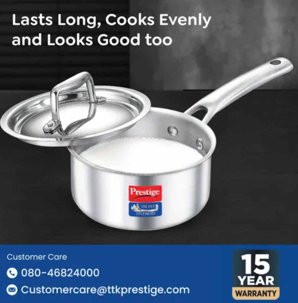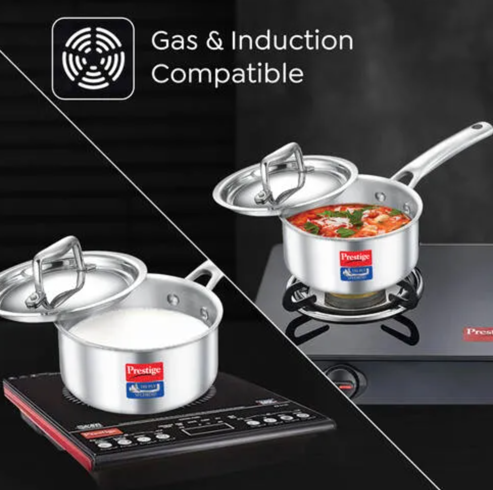 प्रेस्टीज ट्राई प्लाई स्प्लेंडिड सॉस पैन, स्टेनलेस स्टील के ढक्कन के साथ, 18 सेमी, 16 सेमी, 14 सेमी आकार में उपलब्ध।