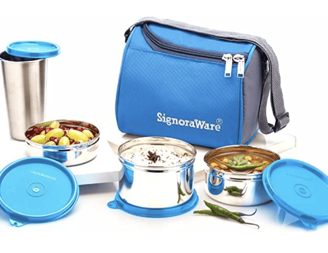 सिगनोरावेयर बेस्ट स्टेनलेस स्टील लंच बॉक्स सेट 4 बैग के साथ | स्टेनलेस स्टील लीक-प्रूफ कंटेनर | फुल मील बॉक्स (कंटेनर साइज़ 350mlx1 | 500mlx1 | 200mlx1 और ग्लास टम्बलर 370mlx1 | रंग नीला)
