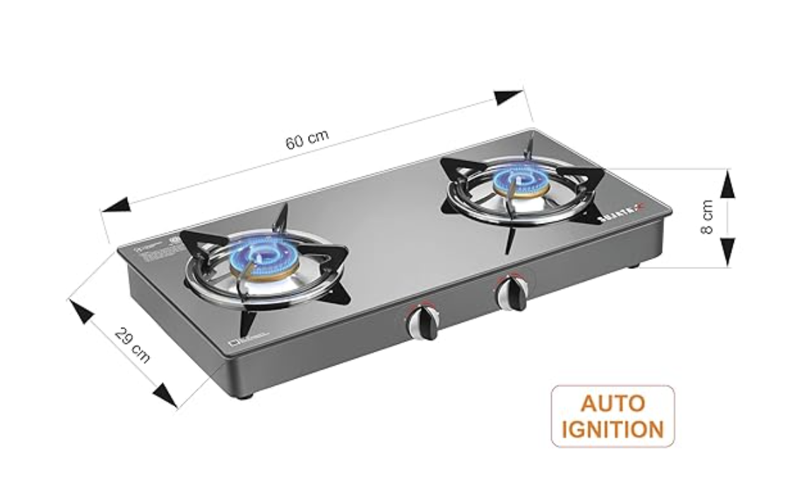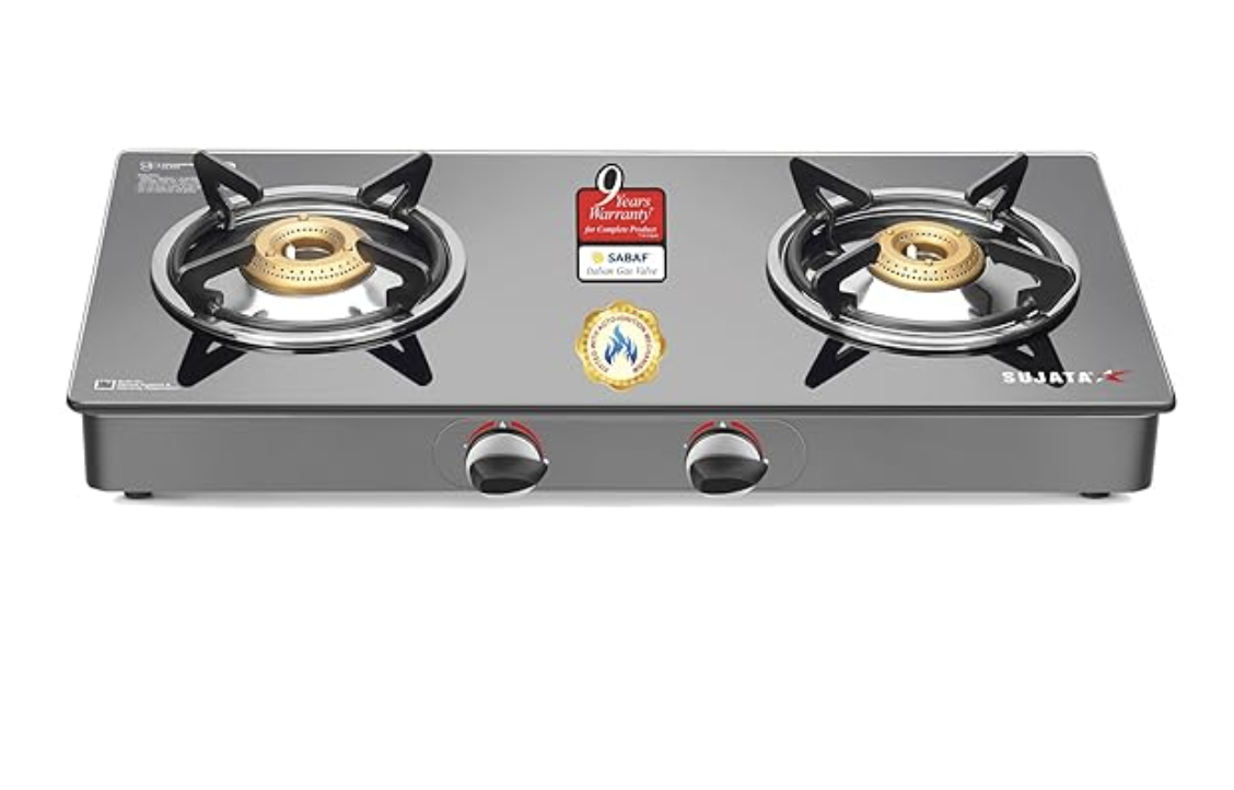 सुजाता ऑटो इग्निशन गैस स्टोव 2 बर्नर | 9 साल की वारंटी | 2 बर्नर गैस स्टोव ग्लास टॉप, स्टोव 2 बर्नर, ISI प्रमाणित, SABAF वाल्व, LPG और PNG कम्पैटिबल, 360° घूमने वाला नोजल (स्टैंडर्ड, काला)
