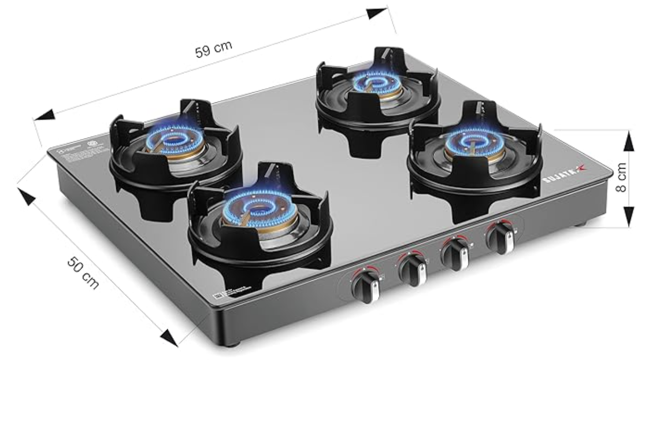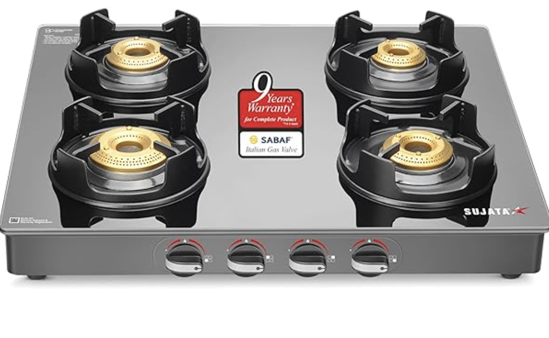 सुजाता डीलक्स गैस स्टोव | 9 साल की वारंटी | 4 बर्नर गैस स्टोव ग्लास टॉप, स्टोव 4 बर्नर, मैनुअल इग्निशन, SABAF, ISI प्रमाणित, हॉब टॉप, LPG और PNG कम्पैटिबल, जंबो ब्रास बर्नर (काला)