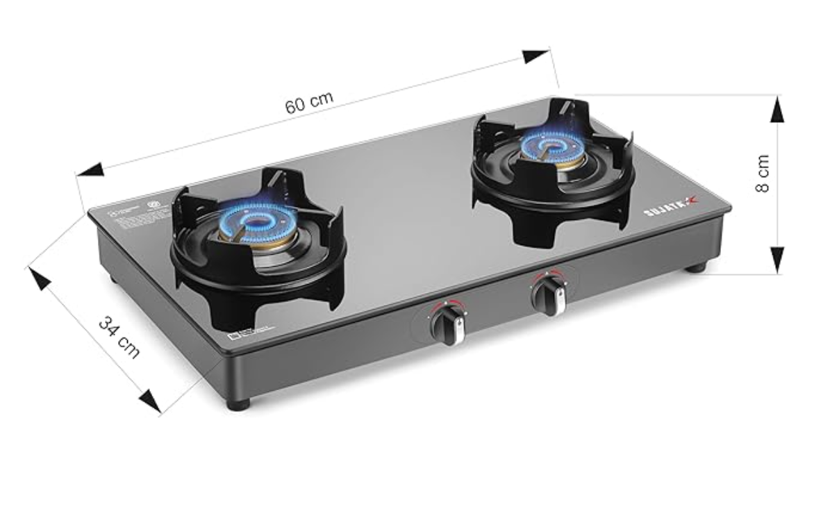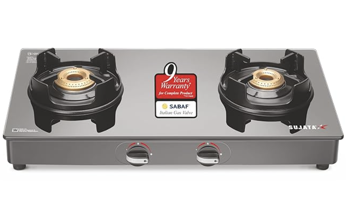 सुजाता डीलक्स गैस स्टोव | 9 साल की वारंटी | स्टोव 2 बर्नर, 2 बर्नर गैस स्टोव ग्लास टॉप, मैनुअल इग्निशन, SABAF, ISI प्रमाणित, हॉब, LPG और PNG कम्पैटिबल, पीतल बर्नर (काला)