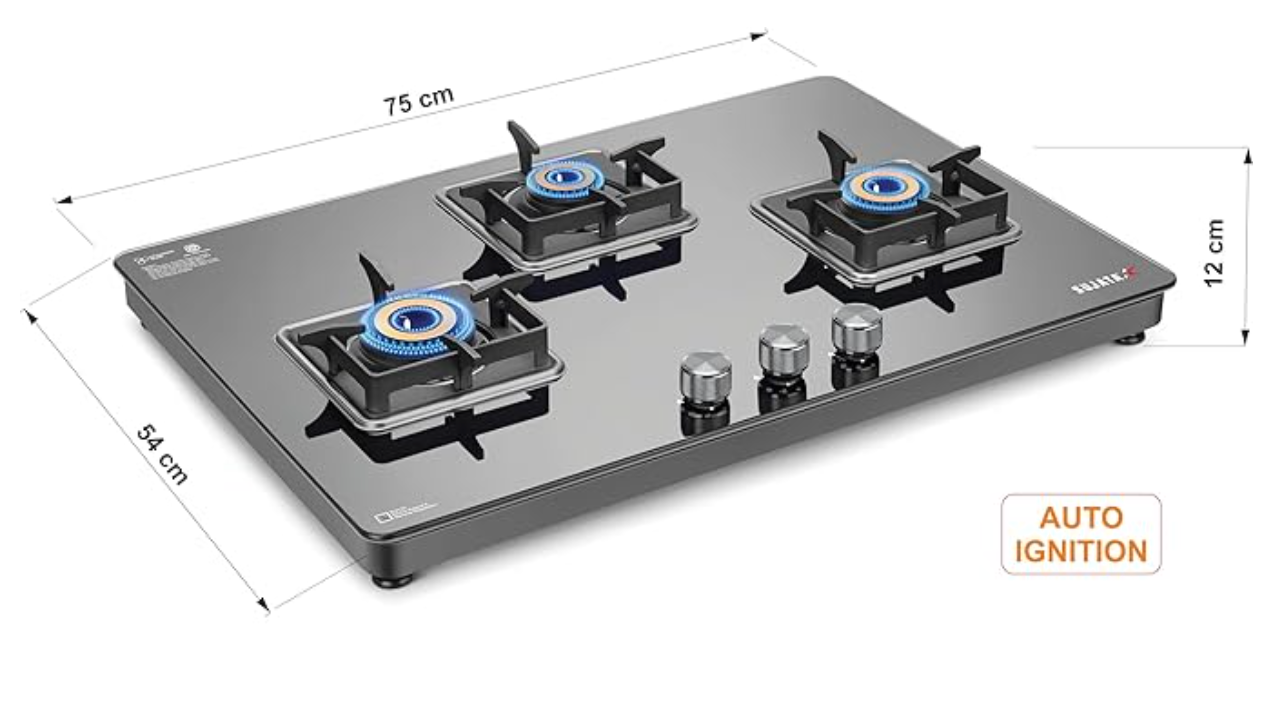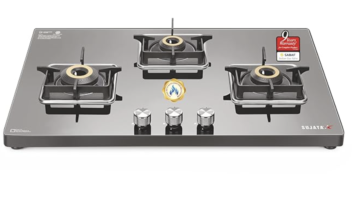सुजाता प्रीमियम AI गैस स्टोव | 9 साल की वारंटी | गैस स्टोव 3 बर्नर ग्लास टॉप ऑटो इग्निशन, SABAF, ISI प्रमाणित, LPG और PNG कम्पैटिबल, 360° घूमने वाला पीतल गैस नोजल, जंबो पीतल बर्नर (काला)