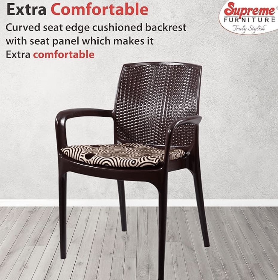 सुप्रीम फर्नीचर टेक्सास डीलक्स प्लास्टिक कुशन चेयर आर्म के साथ घर, गार्डन, ऑफिस, लिविंग रूम, कैफेटेरिया, रेस्टोरेंट, होटल, रिसॉर्ट, इनडोर और आउटडोर के लिए उपयुक्त (4 का सेट, जॉर्डन ब्राउन/ब्राउन सर्कल)